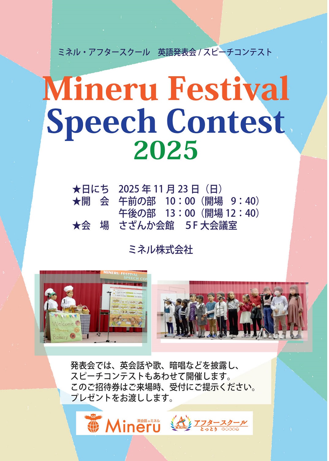 ミネルフェスティバル(英語発表会)とスピーチコンテストを11/24(日)に行います。