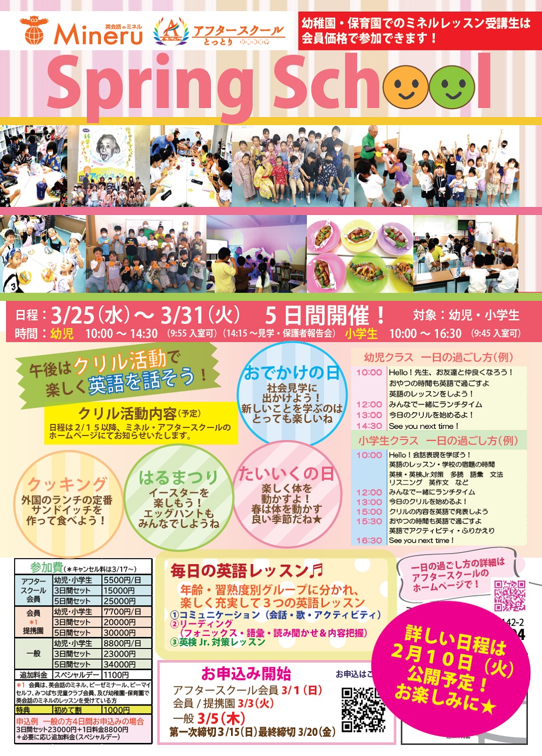 春休み中スプリングスクールを全6日間幼児から小学生を対象に開講します。人気の理科実験、クッキング、おまつり、おはなみを楽しみましょう。お弁当も注文できます。お問合せお待ちしております。