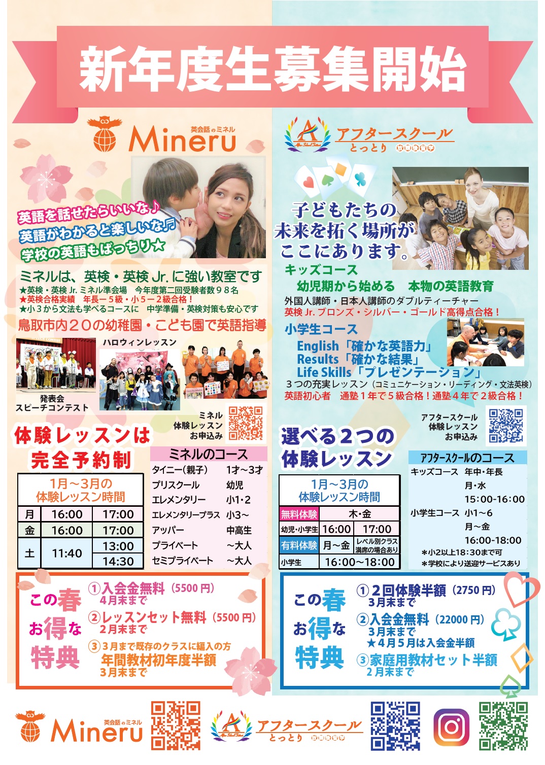 今後の英会話のミネル・アフタースクールとっとり運営について現段階で決定している内容をお伝えいたします。